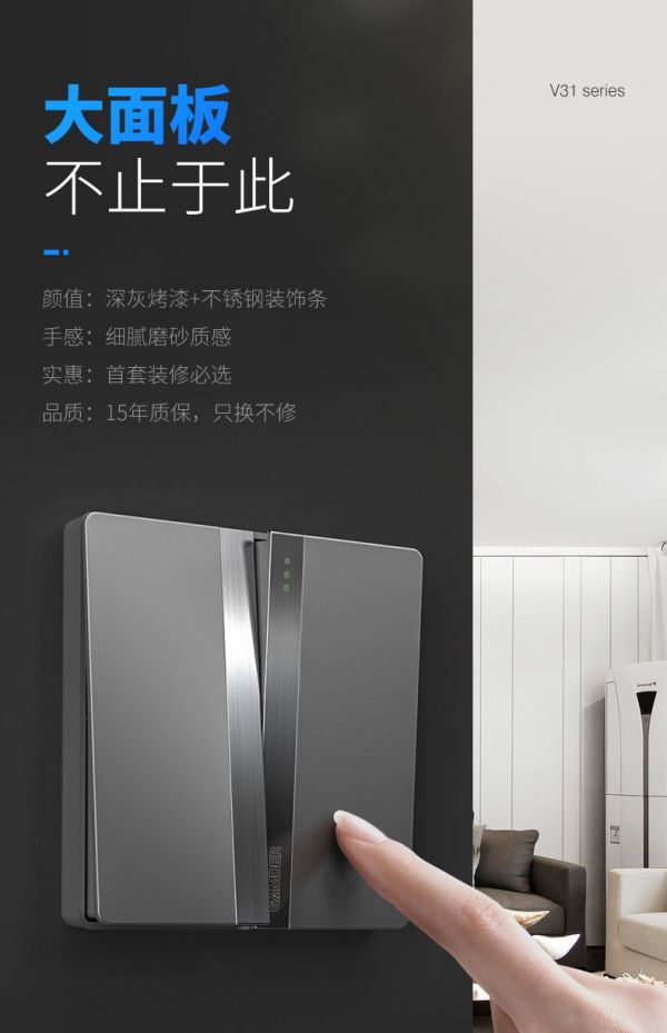 深灰色属于中性色,也是百搭色。加上高颜值,有质感,功能强等优势,V31系列适合安装在别墅、宾馆、会所、酒店、办公楼等高档场所。
