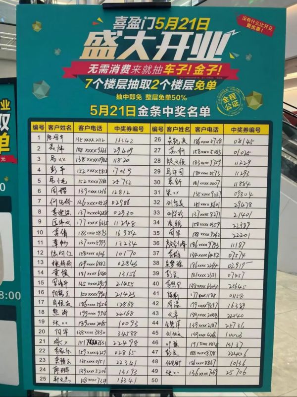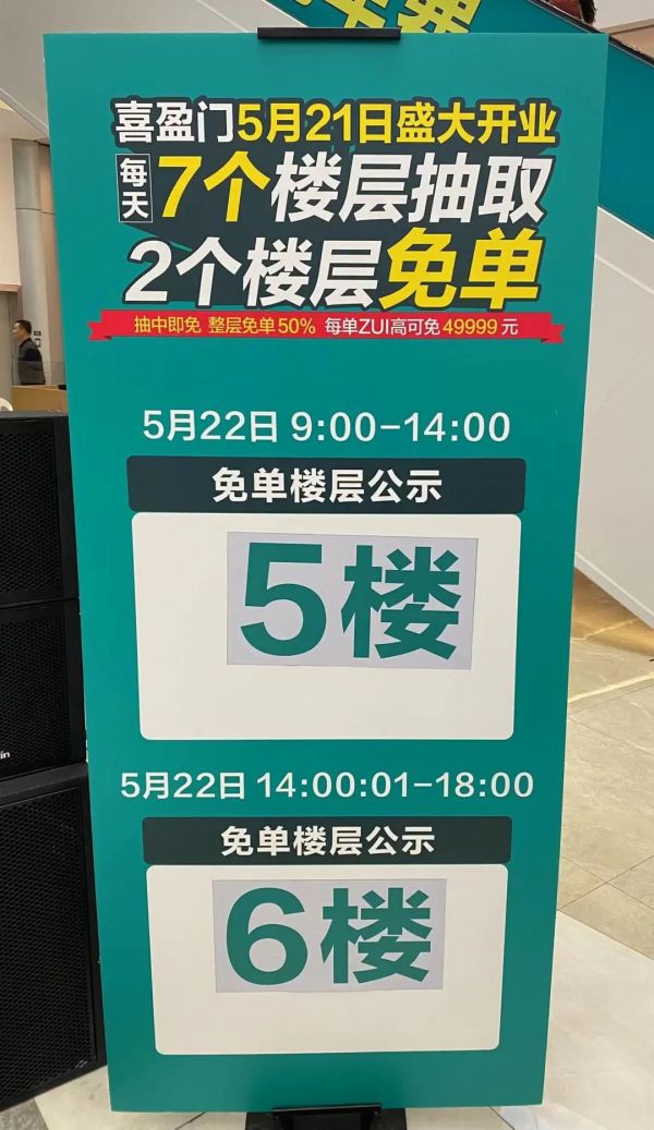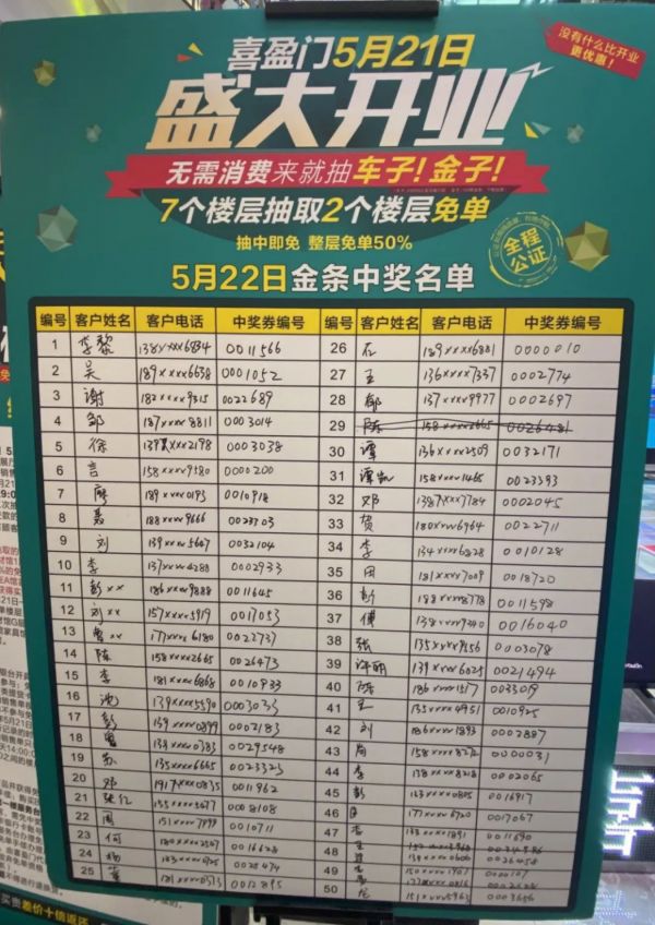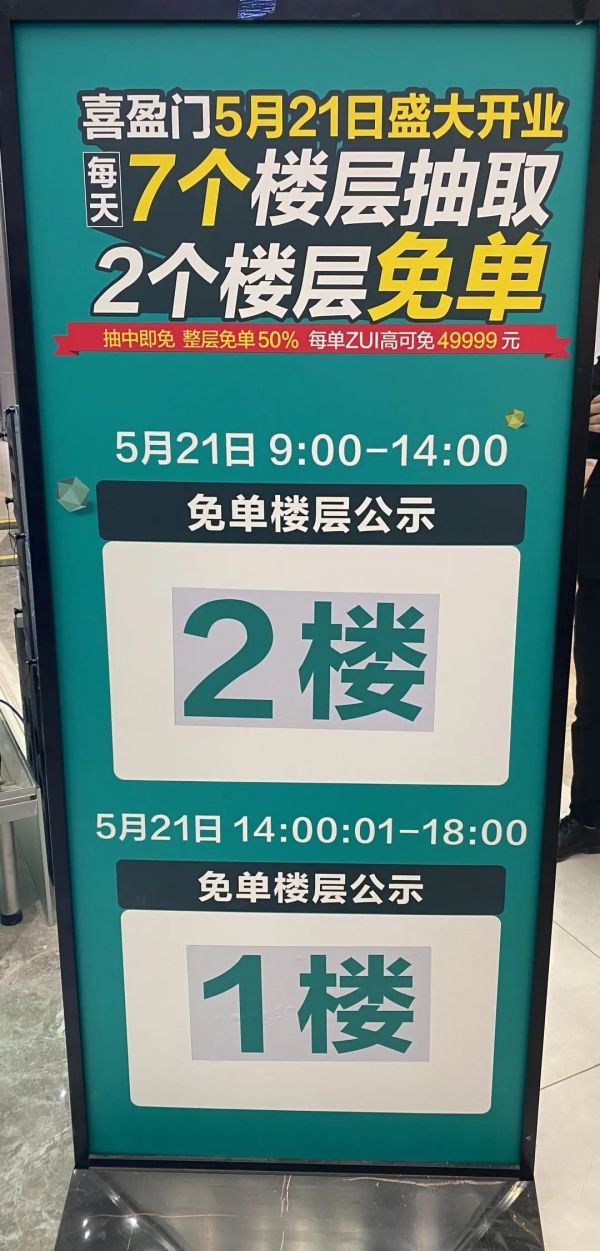 恭喜抽中金条及宝马首付款的所有幸运顾客,同时也恭喜我们两天的四个免单楼层,恭喜所有天选之子!喜盈门将为你们整层免单50%!
