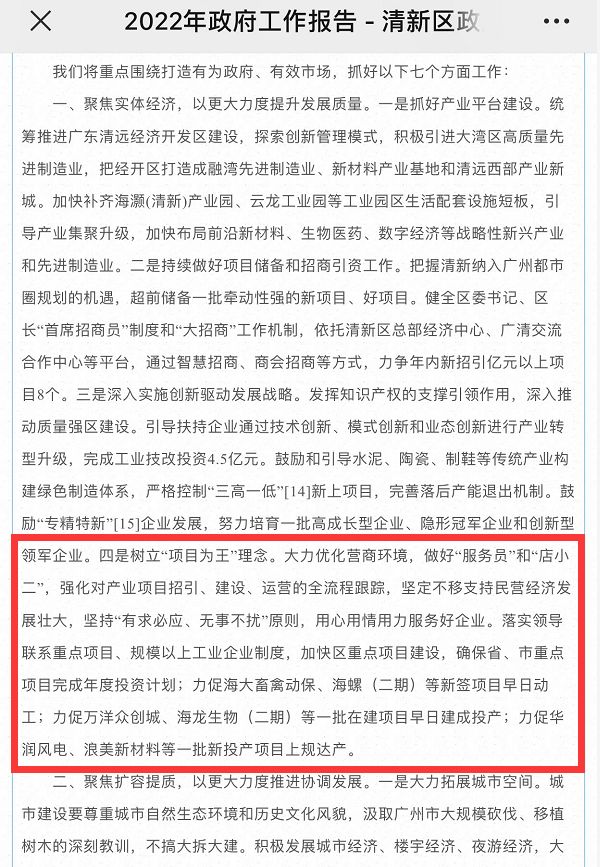 3月2日召开的清远市清新区第九届人民代表大会第二次会议,政府工作报告指出:树立“项目为王”理念,强化对产业项目招引、建设、运营的全流程跟踪,坚定不移支持民营经济发展壮大;力促华润风电、浪美新材料等一批新投产项目上规达产。