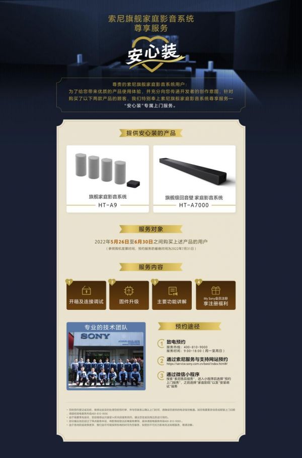 为了给消费者带来更加优质的产品使用体验,传递开发者的创作意图,针对在2022年5月26日至6月30日之间购买了索尼旗舰家庭影音产品HT-A9、HT-A7000的消费者,索尼特别奉上尊享服务——“安心装”专属上门服务,包含安装调试等一系列环节,致力于为消费者带来更优质的影音体验。安心装的服务内容具体包括: