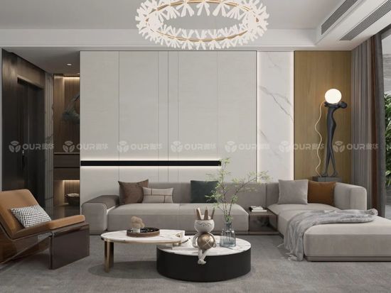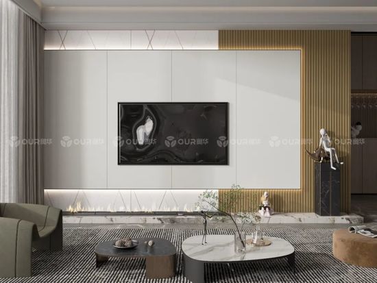 客厅沙发背景墙以黄栗柚为点睛之笔,轻轻触摸墙体表面,能够清晰地感受到木材的纹理,淡淡的暖色调让整个家充满温馨。