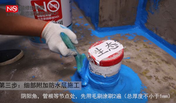 阴阳角,管根等节点处,先用毛刷涂刷2遍涂料(总厚度不小于1mm);