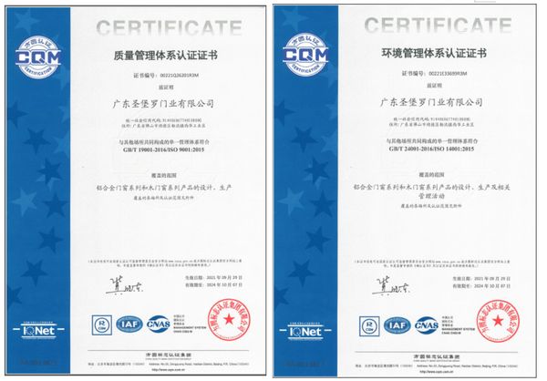 自成立伊始,圣堡罗始终以追求完美的品质为首要任务,通过建立完善的质量管理体系,以及严格的品质过程监控,为产品质量保驾护航。企业严格执行包括:品质检验控制程序、纠正和预防措施控制程序、监视与测量设备控制程序、不合格品控制程序、样品作业规范、品质抽样管理规定、实验室设备管理制度在内的质量控制制度,成功通过了ISO9001:2015国际质量管理体系认证和ISO14001:2015国际环境管理体系认证。公司拥有专业的品质管理团队,分别对购入材料检查、生产过程检查、成品检查、出货检查环节,根据体系要求进行全制程全面的质量监控,严格执行6S高端安全门窗标准,为消费者提供高端产品及配套服务。