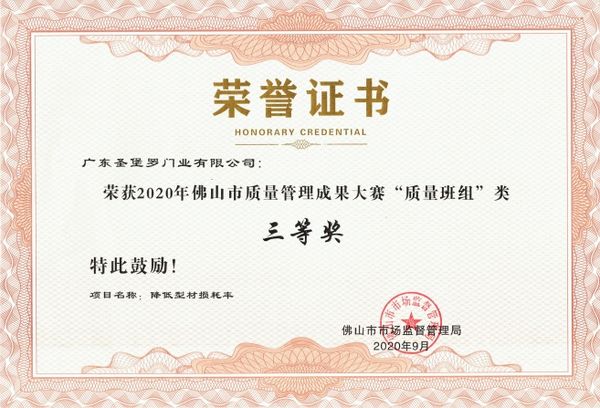 圣堡罗锐意创新,是高新技术企业。拥有多项国家发明专利和过百项实用新型专利、外观设计专利,着力工艺技术的持续提升,为企业产品品质以及创新打下了良好的基础。不仅为消费者提供了非凡的品质体验,更赢得了业界及社会的一致赞誉,2014-2016及2018多年荣获中国木材与木制品流通协会木门窗专业委员会颁发的“全国市场、工程木门企业产品品质、售后服务双承诺活动单位”称号,2017年获得全国工商联家具装饰业商会颁发的《质量品牌5A示范企业》称号,2019年荣获“促进中国门窗制造业质量和服务提升行动示范企业”称号,2020年获得佛山市市场监督管理局评审的佛山市质量管理成果大赛“质量班组”奖项三等奖,2021年荣获“质量信用等级AAA级企业”等多项品质殊荣。