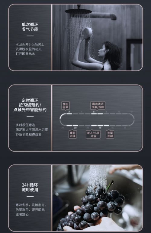 当然我们偶尔需要在非设定时间内用热水,这时候,另外一个很人性化的点动巡航你就能用上了,你只要打开热水龙头(混水龙头的热水端)2秒然后在5秒内关闭,即可触发零冷水功能,稍等片刻,水管加热后,热水就源源不断供应了。