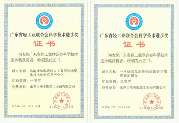 其中,高清通体陶瓷砖项目荣获中国轻工业联合会科技进步二等奖、广东省轻工业联合会科技进步一等奖;