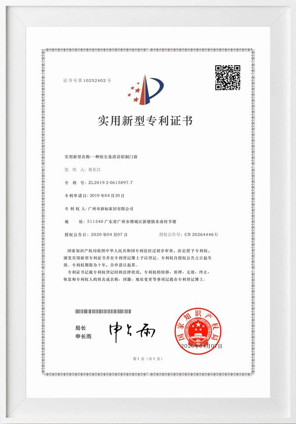 多年来,新标门窗始终以技术先行,通过持续创新实现产品技术变革,自主研发百余项专利技术,为消费者提供更高质量的家居产品。获得涉及到多重密封条外开窗结构、水循环式除尘装置、防尘易清洁铝制门窗、隔热结构的铝制门窗、护墙板框架及铝木护墙板、门窗铝型材、纱窗边框型材等方面的专利。