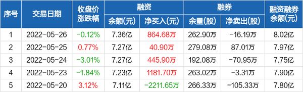 融资方面,当日融资买入3317.09万元,融资偿还2452.41万元,融资净买入864.68万元,连续4日净买入累计2533.18万元。融券方面,融券卖出5.49万股,融券偿还21.68万股,融券余量262.9万股,融券余额6569.75万元。融资融券余额合计8.02亿元。
