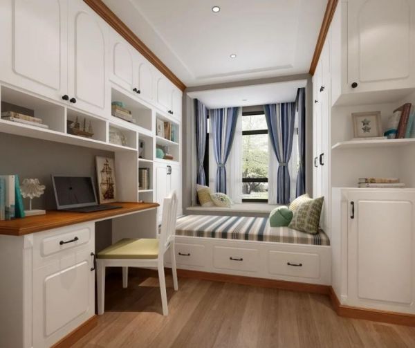 YOYO建议沿墙边定制L型榻榻米+书桌组合,留出更多的活动空间。一面墙定制为一体式书桌柜,可办公、学习;另一边打造为舒适休息区+衣物收纳区,多重功能的设计,一站式搞定“玩学储住”。