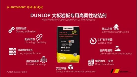 针对比较大块的瓷砖,邓禄普有着更加针对性的产品,大板岩板专用高柔性粘结剂是一种适用于墙面和地面的聚合物改性水泥基瓷砖粘结剂,采用独特增强型抗滑移配方,具有超强的抗滑移性能和粘结性能,是粘贴岩板、陶瓷薄板、大板、大尺寸玻化砖、及任何吸水率瓷砖和非湿气敏感型石材的理想选择。本品由高标号水泥、精细骨料、超强聚合物及特殊添加剂混合而成。
