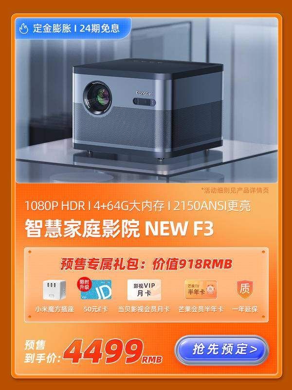 当贝投影「F系列」产品的后起之秀,是性能旗舰当贝F3的升级款。拥有2150ANSI流明的亮度,不仅仅在画面效果上令人惊喜,还能轻松支持4K超清解码,双USB 3.0设计;高端影院专属的HDR10和Hybrid log-Gamma高动态视频解码技术让影片原色更亮彩夺目,画面纤毫毕现。这次预售,4000元左右的旗舰投影仪,当贝NEW F3值得一个你宠她的机会,超值预售专属礼包,大屏影音的震撼体验,打造专属于你家的光影世界。
