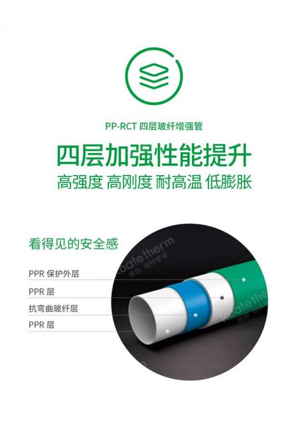 koate®therm德国阔特PP-RCT 四层玻纤增强管,四层结构,四层结构内外层为PP-R材料,中间层采用纤维增强PP-R材料,耐高温性能更高,膨胀系数低,高刚度、抗冲击性能更好,使用寿命更长。