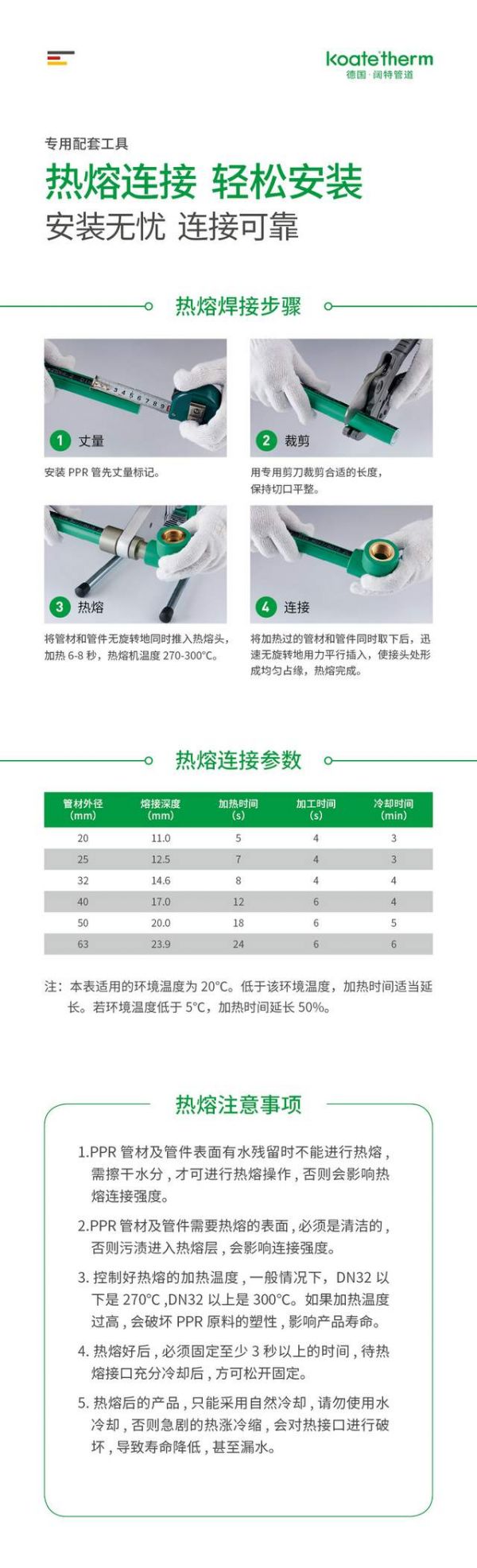 koate®therm德国阔特PP-R双层瓷芯抗菌管采用热熔连接,连接处强度高于管材本身质量,杜绝漏水隐患,一经连接,终身适用,操作简单快捷,易施工易维护。