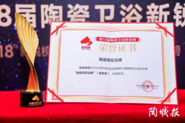 在颁奖典礼上,冠珠瓷砖凭借领跑同行的品牌实力和产品实力,获新锐榜评审委员会的高度认可,斩获新锐榜“陶瓷领军品牌”、“岩板金奖”两项重量级大奖。