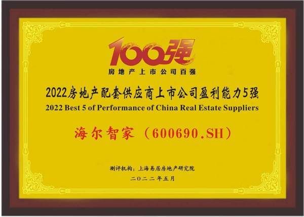 智能快讯|海尔智家荣膺2022房地产配套供应商上市公司盈利能力5强