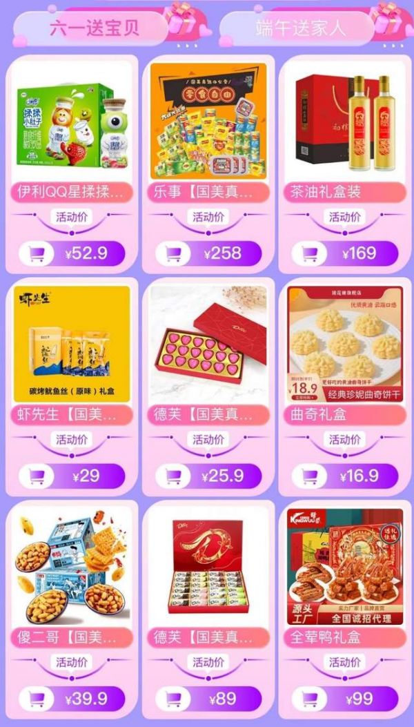 此外,“六一嘉年华” 全场低至9.9元、“粽香四溢”粽子礼盒低至39元、“大牌名酒抢先购”10元起秒杀、“家居大放价”全场低至6.9元等多个专场同时上线,尤其是在“粽香四溢”专场,五芳斋、诸老大、屈姑、知味观等诸多品牌荟萃,鲜肉粽、蜜枣粽、豆沙粽等多种口味齐聚,为端午节的到来增添浓厚的节日气氛。其中,屈姑虎头粽礼盒4味10粽仅39元,既有北方消费者喜欢的甜粽,也有南方消费者偏爱的肉粽,仅1盒就能购买到天南海北的美味体验。