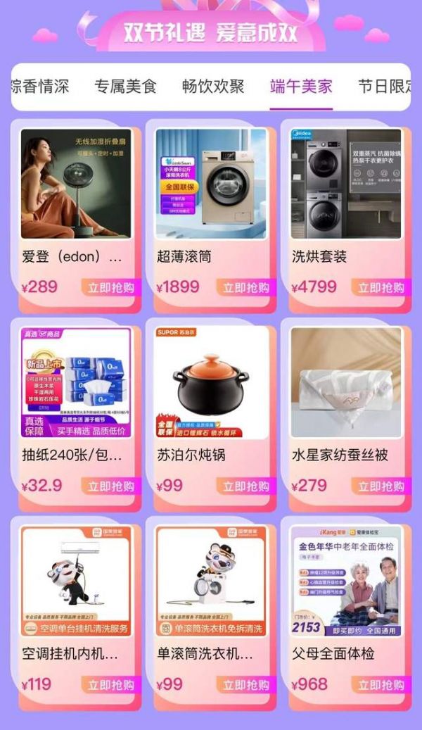 端午节向来是中国家庭祈福安康、期盼团建的日子,在“双节礼遇 爱意成双”版块,有适合扮美家庭小天鹅家用大容量智能滚筒洗衣机,活动价1899元,每满1000减100,最多可减800元,到手仅需1799元;有家居日用离不开的国美真选抽纸,240张/包,30包仅需32.9元;还有空调清洗、家用洗衣机等清洗服务,以及门市价2153元,活动价968元的【IUV爆款】老年全面体检套餐,致力为每个中国家庭送上从内而外的贴心呵护。