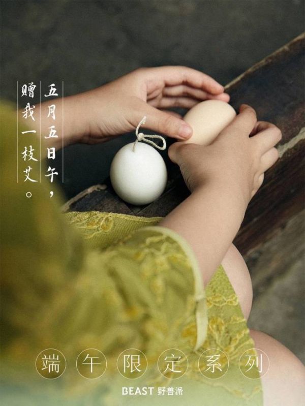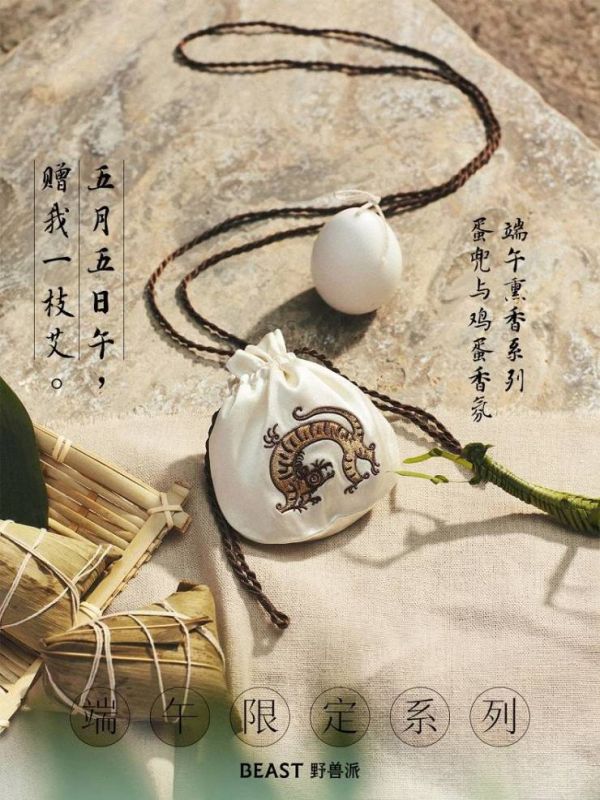 端午期间,民间除了佩香囊,还有立鸡蛋的习俗。据说当天能成功将蛋立起来的人未来一年都会有好兆头,以此为灵感,野兽派还别具匠心地设计了一款蛋兜与鸡蛋香氛——鸡蛋形象的蛋形蜡烛栩栩如生,它正常鸡蛋一样大小,手感圆润,小朋友也可放心拿在手里。特别设计的100%重磅真丝蛋兜,奶白色耐看经典,还能当成腰包佩戴,将蛋形蜡烛放到蛋兜里,蛋兜可随身携带,好运连连,妙趣横生。同系列的国风蜡烛,还原仲夏季茁壮的青青艾草,罐身上的粽子、纸鸢、艾草都是美好意象,居家随行,丰俭由人。