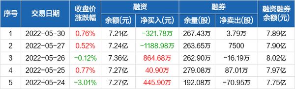 融资方面,当日融资买入1799.33万元,融资偿还2121.11万元,融资净偿还321.78万元。融券方面,融券卖出8.89万股,融券偿还5.1万股,融券余量267.43万股,融券余额6768.67万元。融资融券余额合计7.89亿元。