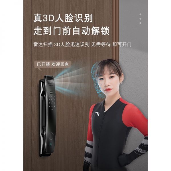 德铠曼智能锁的3D人脸识别技术可适应无光、变化表情、妆容造型等多种实际使用环境,无论男女老少都方便,让整个开门过程更便捷,也更安全。在解锁过程中,不需要用户特地按压门把手,识别脸部即可自动解锁。在双手都被占用时,完成人脸识别后,身体轻靠上去即可将门打开,真正做到解放双手。