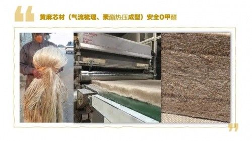 对比含有大量甲醛的硬棕板,黄麻芯材则是采用聚酯纤维为粘合材料,德国设备梳理纤维,热压一体成型,轻松绕道化学胶水与甲醛。