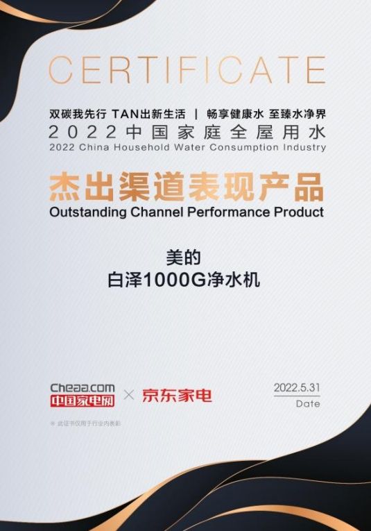 作为家庭全屋用水领域的领军品牌,美的积累了大量的研发资源和渠道资源。此次,美的厨热2个杰出渠道表现产品大奖,对应的产品分别为美的白泽1000G净水机、美的电热水器F6032-UD(HE)。