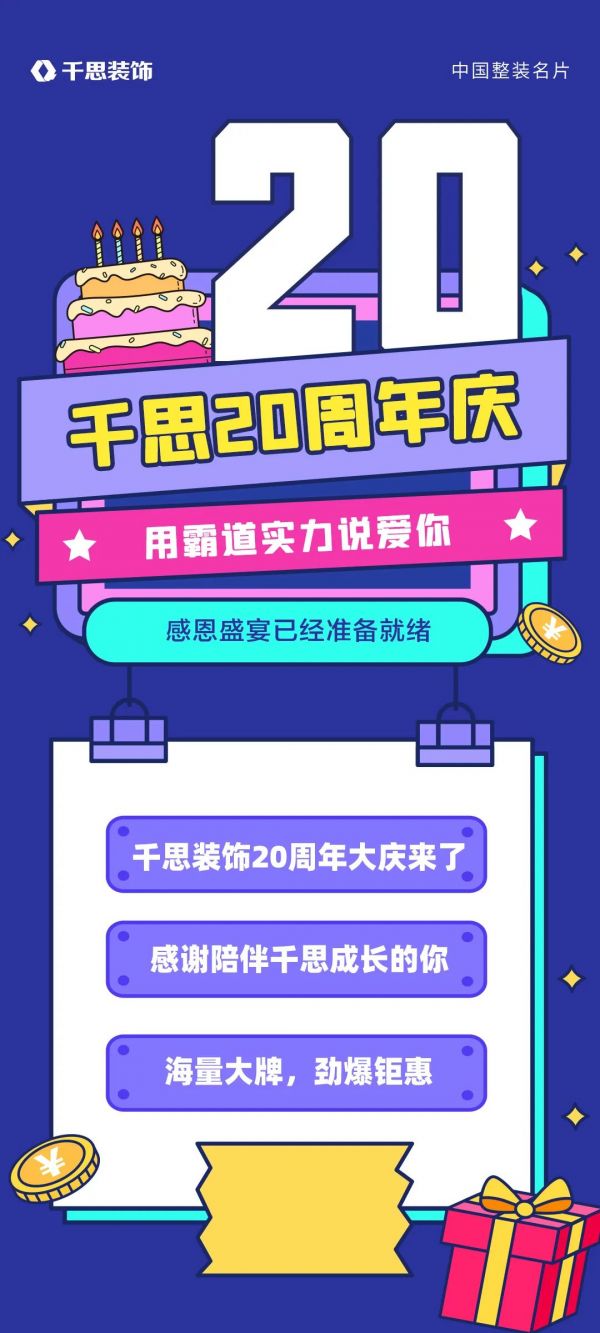 千思装饰20周年大庆来了!感谢陪伴千思成长的你千思20岁生日感恩盛宴已经准备就绪海量大牌,劲爆钜惠用霸道实力说爱你!