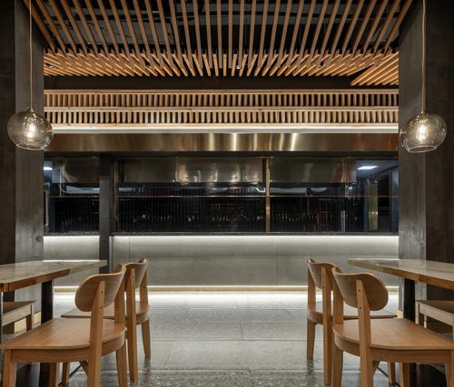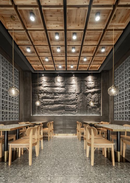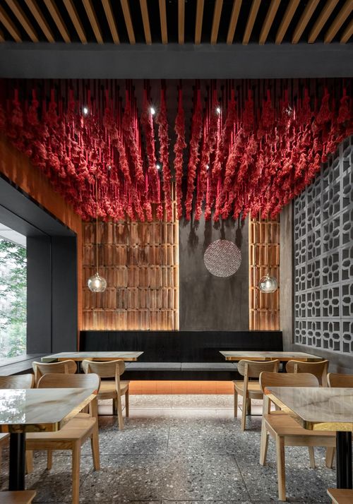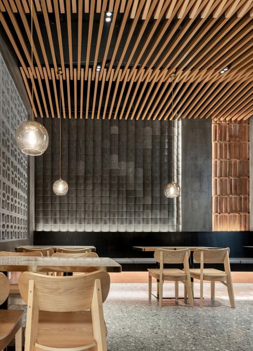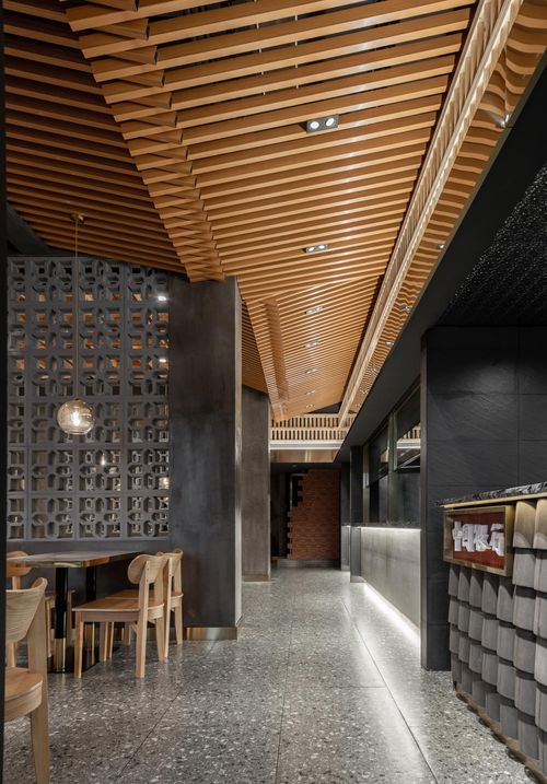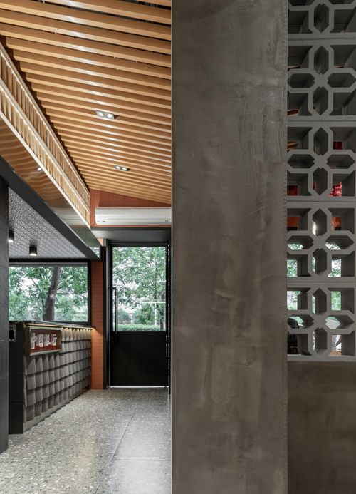 本案空间大量运用似乎早已被时代摈弃不用的砖瓦麻绳与木质元素,重新进行罗列组合,与波纹板,不锈钢,等现代感十足的材料碰撞出新的火花,带来不一样视觉观感。
