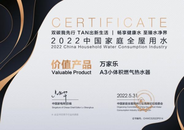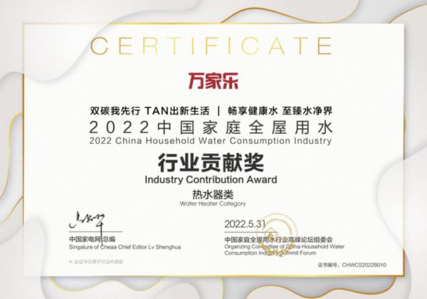 凭借在品牌及产品创新方面的杰出表现,万家乐一举斩获“2022中国家庭全屋用水行业贡献奖”、“2022中国家庭全屋用水双碳践行绿色品牌”等品牌奖项,万家乐A3小体积燃气热水器、万家乐晨露600即热式凉白开净水器,获得“2022中国家庭全屋用水价值产品”、“杰出渠道表现产品”等殊荣。