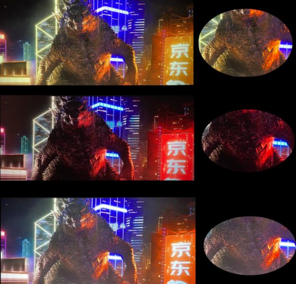 在《哥斯拉》这部影片中,我们可以仔细观察下黑暗场景下哥斯拉的细节,图一的暗部细节比较丰富,而图二色彩过于浓艳导致暗部丢失了很多细节,这就是三色激光电视未经色彩调校会出现的状况;图三的暗部细节虽然也比较丰富,但整体呈现发白的情况,这是一味追求亮度而牺牲色彩的画面效果。色域过广不加以校色,或只注重拔高亮度,都会导致画面色彩以及细腻程度的损失。