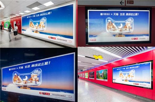 除了华润小径湾的“世外桃源小灯泡”快闪活动,大家还可以在地铁灯箱看到月影家居和天猫618联合的“猫头”形象。