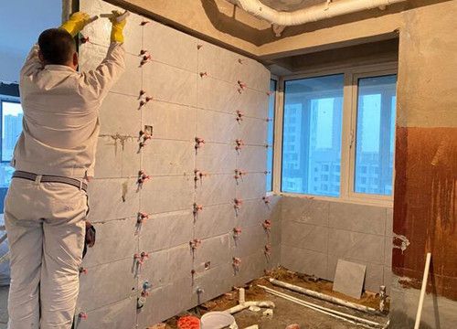 在贴瓷砖时,要注意给墙面洒水湿润,这样可以避免墙面过快吸收水泥砂浆的水分,导致瓷砖出现空鼓、脱落等问题,如果采用瓷砖粘接剂铺贴的话,要提前对墙面做找平处理。