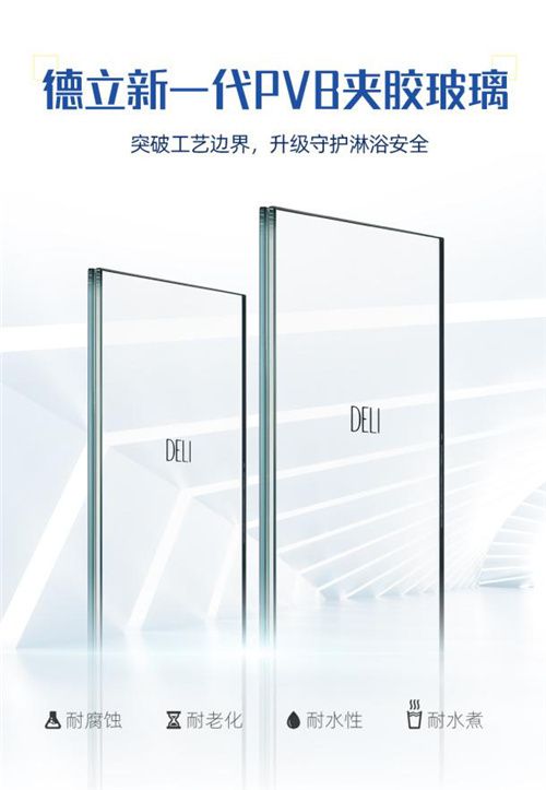 德立今年升级了新一代PVB夹胶玻璃淋浴房,从“原材”、“工艺”、“安全系统”三个维度解锁淋浴房玻璃的安全密码,一举刷新了淋浴房的安全新高度。新一代PVB夹胶玻璃由于其两片普通玻璃中间夹的PVB膜的粘接作用,不会像普通玻璃破碎后产生锋利的碎片,可以有效防止了碎片飞溅扎伤等事件的发生,确保了人身安全,让消费者无需为淋浴房玻璃的安全问题所困,德立淋浴房以匠心精神打造安全舒适的淋浴房产品,为消费者的安全淋浴保驾护航。