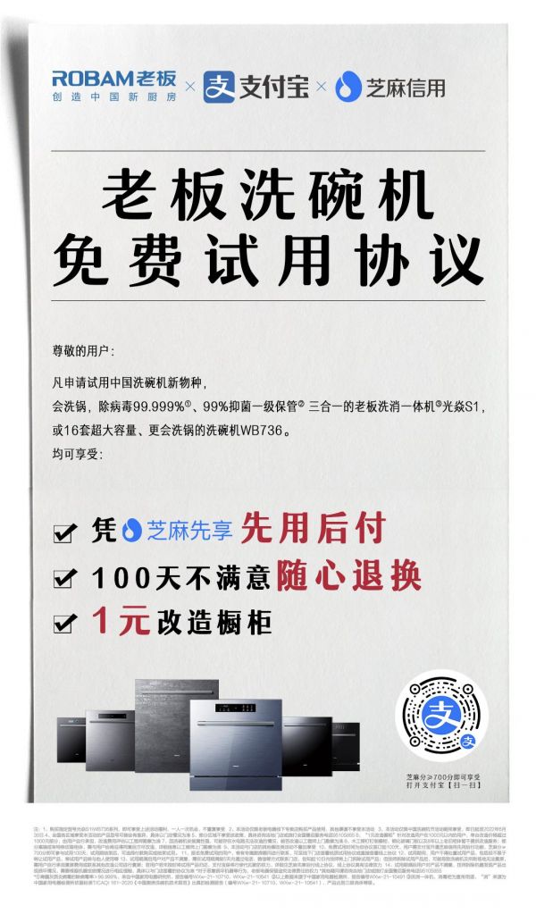 老板电器作为中国高端厨电领导品牌,为推动中国洗碗机普及让用户真正了解洗碗机,6月1日-6月30日将开启100天免费试用活动。区别于普通洗碗机品牌试用,老板此次活动是联合支付宝芝麻信用合作,真正实现了先用后付款的活动链路,产品试用涵盖光焱S1和WB736两款洗碗机型号。消费者只需进入支付宝小程序,选择试用洗碗机型号获得预授权即可签署试用协议,预留试用资格。工作人员收到留资信息后,将第一时间联系用户确认试用产品并进行线下协议签署,随后老板将安排工作人员进行上门安装真正使用。