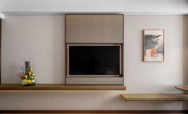 摆放在客人坐在床头或沙发上便于观看的位置,现代的电视背景墙以简约风格为时尚,不仅要起装饰作用,还要有吸音降噪作用。