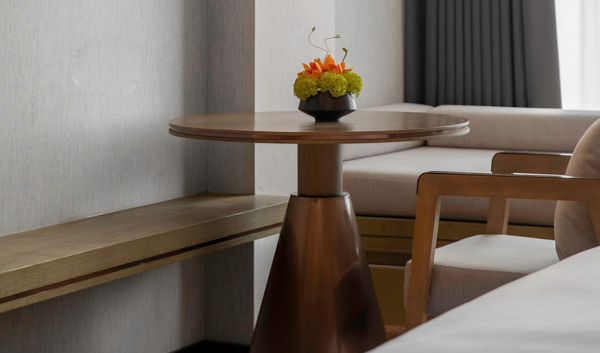 左侧墙面悬挂艺术壁画,正对休闲区,当客人坐在沙发上,抬头一望便能看见壁画。设计师精心挑选了有特色的床头灯和造型别致的小摆件,提升了整个空间的艺术品位。照明灯具的选择,除了造型美观外,还要防眩晕且耐用。床上用品,配合客房的整体风格,并且根据季节的不同适时更换,调节客人心情。
