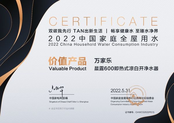据悉,近期举办的2022中国家庭全屋用水高峰论坛上,万家乐晨露600净热一体净水器还一举夺得“2022中国家庭全屋用水价值产品” 称号。晨露系列净水产品的上市,将进一步完善国人饮水习惯,让用户享受安全、便捷、舒适的饮水新生活。
