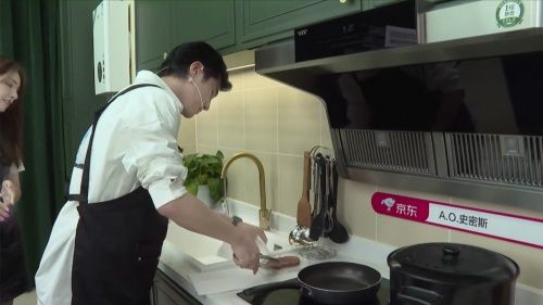烹饪担当的姜潮,在直播现场大展厨艺,做起了拿手好菜煎牛排,期间A.O.史密斯「瀞」油烟机全程开启,夫妻俩被大吸力也安静、爆炒档也安静的效果所惊艳。