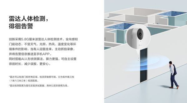 萤石CP3智能可视门铃采用了5.8G厘米波雷达人体检测技术,当有人走来就会主动抓拍录像,并推送告警信息至手机,且不受天气、光照、热风、温度变化等环境条件的影响。
