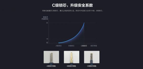 作为一把锁的核心组件,它的重要性不言而喻。目前市场上主要分为a,b,c类锁芯,其中C类锁芯最难破解。虽说锁都是防君子不防小人,但相比之下,小偷往往会选择更好破解的普通锁,这是相对安全的属性。