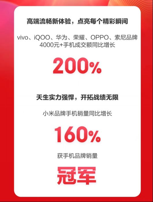 京东数据显示:晚8点开场10分钟,高端笔记本成交额同比增长177%,平板电脑成交额同比增长超100%,高性能创作本成交额12小时同比增长160%。家电全品类4小时成交额超去年全天,其中中高端家电产品成交额超去年全天,家电新品成交额超去年全月;vivo、iQOO、华为、荣耀、OPPO、索尼品牌4000元以上高端手机成交额同比增长200%;开门红1小时,户外电源成交额超过去年全月。