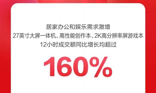 越来越多的白领一族意识到,拥有一台趁手的办公装备,是在居家状态下高质量和高效率达成工作目标的关键。战报显示,开门红前12小时,具备更高性能、更极致使用体验的27英寸大屏一体机、高性能创作本、2K高分辨率屏游戏本成交额同比增长均超过160%。显卡、固态硬盘等DIY电脑组件品类在装备换新升级中迎来销售热潮,6小时成交额超去年全天,三模热插拔机械键盘4小时成交额超去年全天。