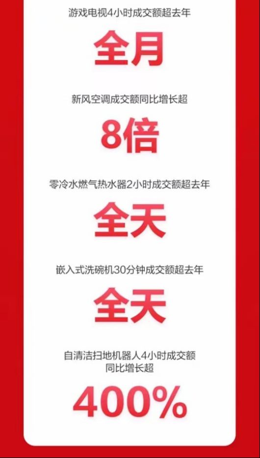 带来居家生活幸福感的家电品类中,守护全家呼吸健康的新风空调4小时成交额同比增长超8倍;精致美观的嵌入式洗碗机30分钟成交额便超去年全天;智能便捷的自清洁扫地机器人4小时成交额同比增长超400%。嵌入式空调4小时成交额同比增长300%;冰洗套装成交量同比增长超6倍;雅萌成交额同比增长超10倍;方太高端超薄烟灶套装成交额同比增长4.5倍;零冷水燃气热水器2小时成交额超去年全天。