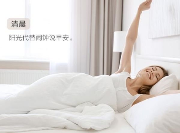 起床时间到,背景音乐缓缓响起,遮光帘打开四分之一,日光洒进床前,温暖的阳光轻柔唤起身体的每一寸,精神一整天。当你离开卧室后,摄像头开启防卫模式,卧室的灯光以及空调自动关闭,节能又环保。