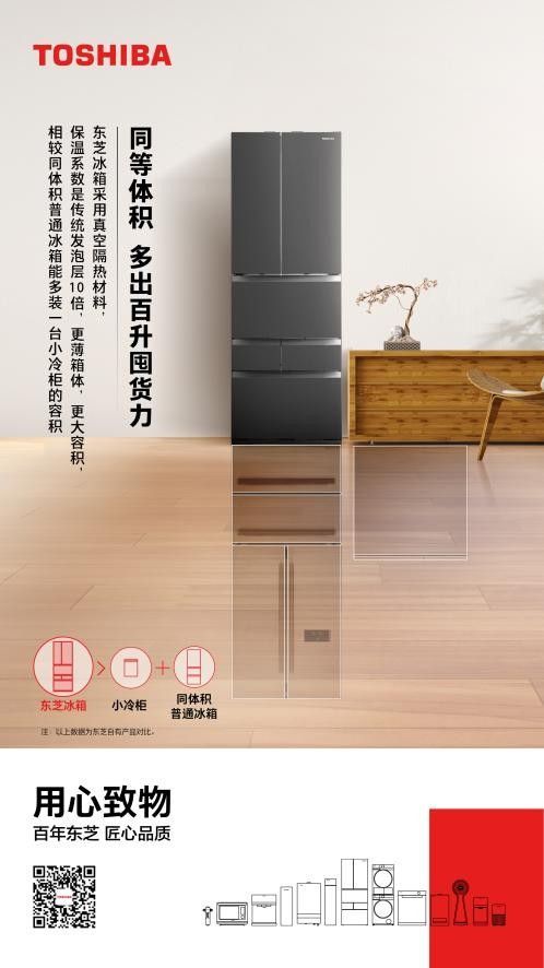 当大量囤货需求,遇到实际居住面积的约束,东芝一举击破这个难题。采用真空隔热材料,相比于普通聚氨酯发泡层,东芝冰箱箱体纤薄厚度仅为前者1/3,保温系数则是其10倍之高,使得冰箱外在体积小、内里容积却够大,满足囤货所需,释放更多家居空间,相较于同体积冰箱,东芝冰箱多出近百升囤货空间,约等于一台小冷柜的容积。
