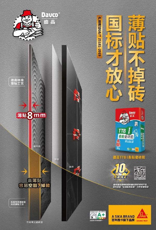 在这里给大家推荐德高TTBI瓷砖胶,粘接材料厚度减少到3mm~8mm,我们取最大值8mm,再用刚才的房间换算一下,整个房间贴完仅占用了0.096平方米,节省了大概0.2~0.5平方米!以广州目前房价为例,我们按照4万元/平米计算,德高TTBI瓷砖胶的薄贴仅一间房间就给我们节省了至少七八千至多两万块钱!所以切记,贴瓷砖一定要薄贴!