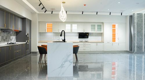 馨居尚装饰集团总部位于成都驷马桥东立广场4楼。一整层的开阔空间容纳了包括设计部、主辅材电器展示、样板间展示等多重功能空间。这个巨大的开阔空间完全是按照唐建武的构想打造的,在采访中他也不止一次的提到,整装的未来是大店的。