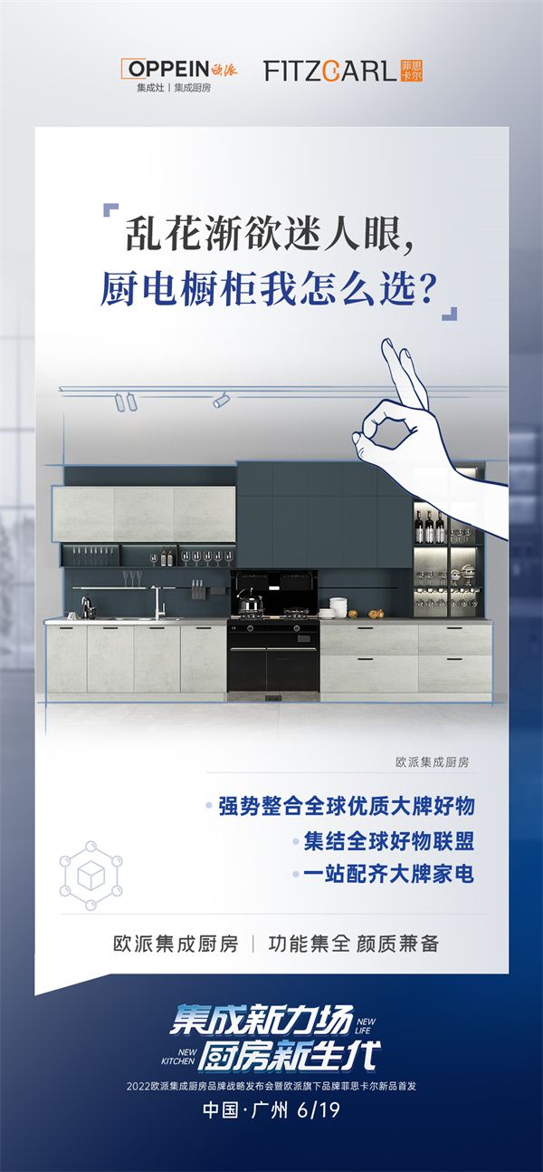 近日,“集成新力场·厨房新生代——欧派集成厨房品牌战略发布会暨欧派旗下品牌菲思卡尔新品首发”发布会将于6月17日在欧派家居集团总部举办,届时,欧派还将首次推出“集成厨房”概念,让柜电真正成为一个统一整体,开启中国集成厨房新纪元。
