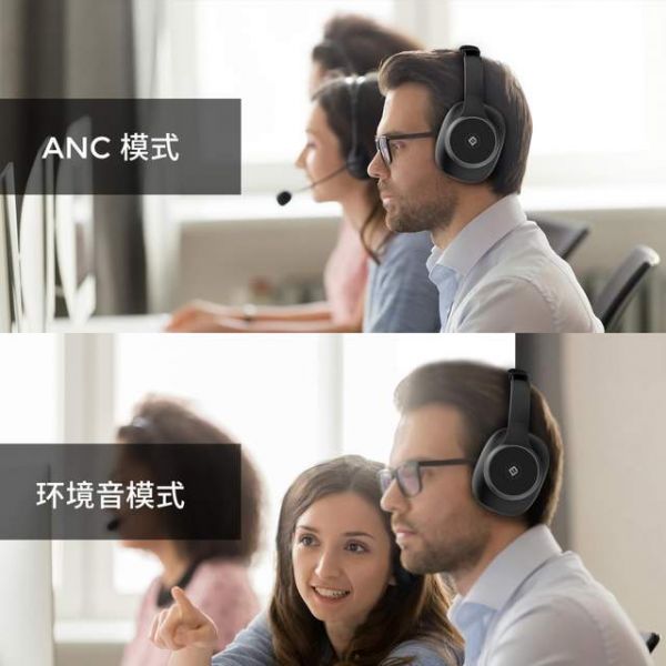 HS150还配置了ANC及环境音两种模式,让用户根据自己当下所处状态进行随意切换。ANC模式即Active Noise Cancellation主动降噪,从声源处实现降噪,当想要专注于自己的工作时,切换成ANC模式,则可以主动阻隔外界噪音;在电话通话时,也可以通过ANC模式,过滤周围噪音确保通话质量。而当你想与身边其他人说话时,可切换成环境音模式,不用取下耳机就能进行正常交流。