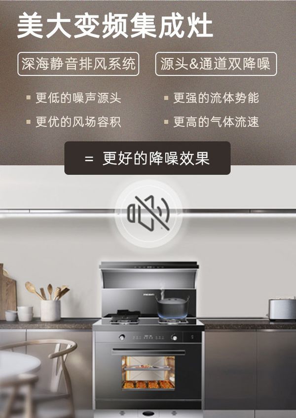 集成灶风机下置,噪音源远离人体,美大集成灶采用多重降噪技术,更拥有超低噪音设计,烹饪时噪音更低,能够很好地提升做饭的体验。
